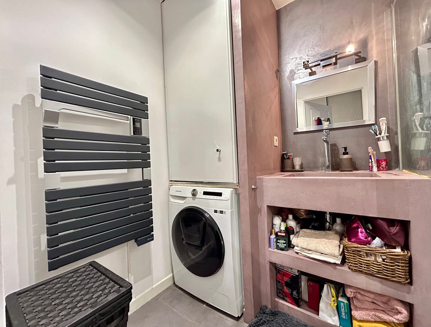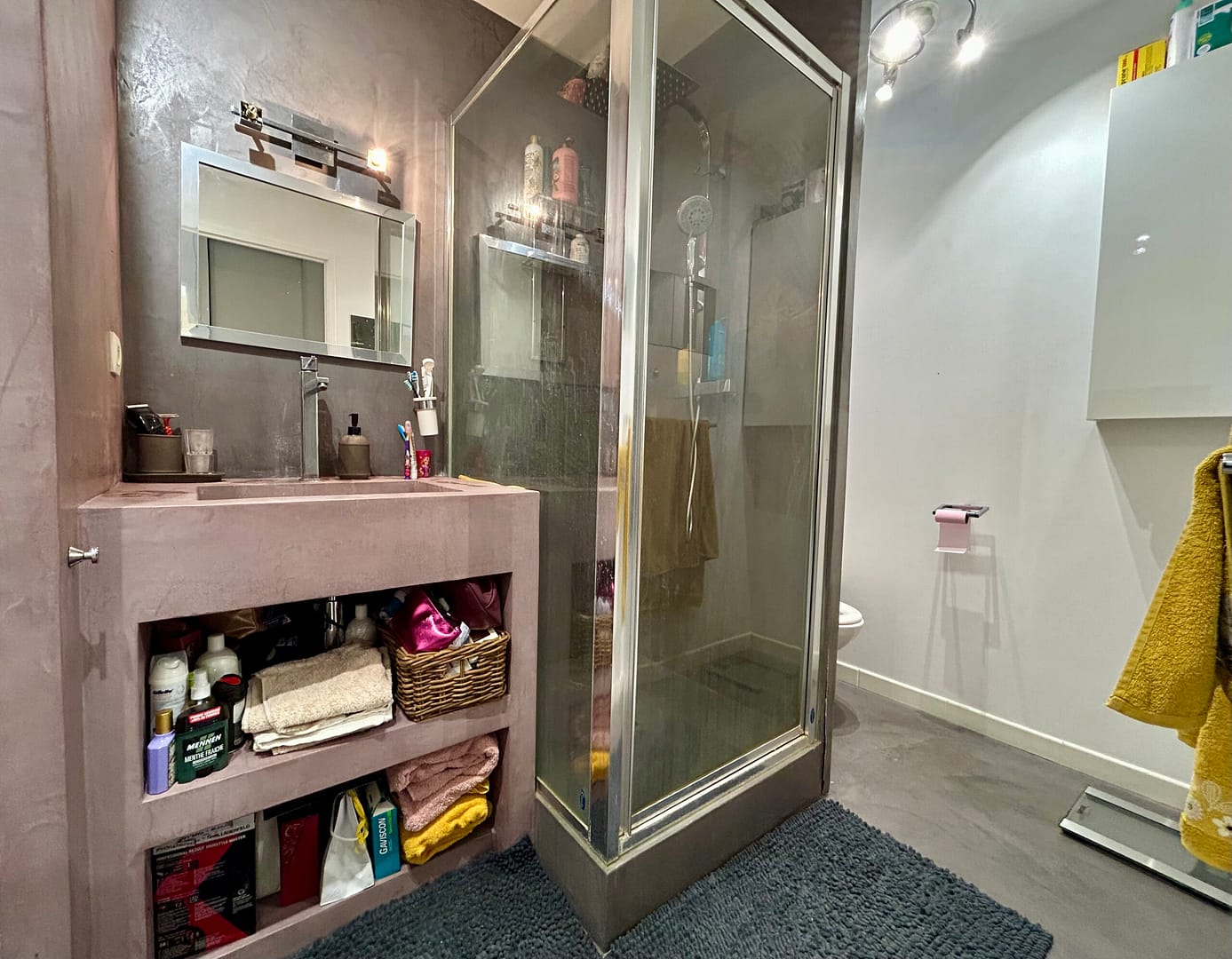 Salle d’eau contemporaine en béton ciré, avec WC suspendu et sèche-serviette