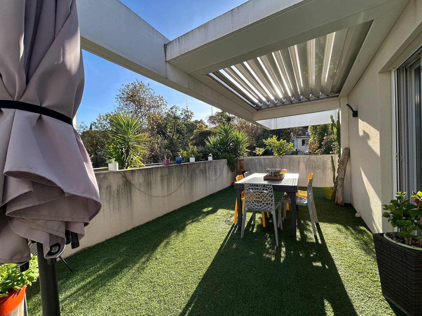 - La terrasse est équipée de 3 pergolas bioclimatiques automatiques, pour profiter pleinement de l’extérieur en toute saison.